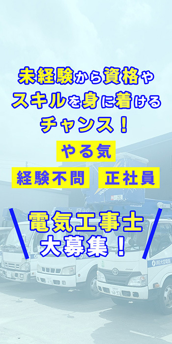 | 求められる人物像 | ◎ コツコツと真面目に取り組める方 ◎ 分からない事は積極的に質問できる方 ◎ 地元で新しい電気工事の仕事にチャレンジしたいという気持ちをお持ちの方 |